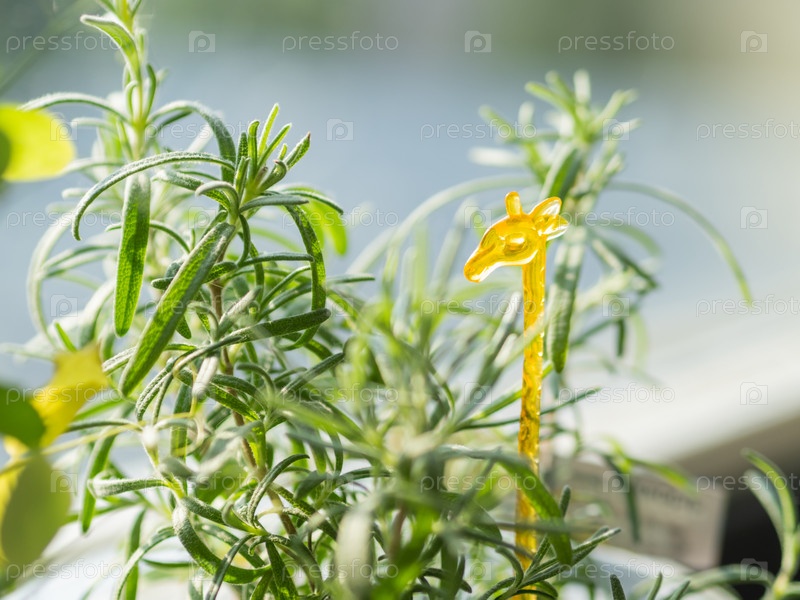 Желтый пластиковый жираф в цветочном горшке с растущим розмарином. Проращивание лекарственных трав в домашних условиях. Органическое растение и декоративное животное на подоконнике
