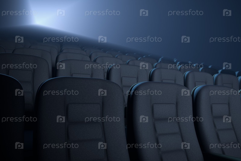 Пустой кинозал. Свободные ряды сидений. Луч кинопроектора на заднем плане