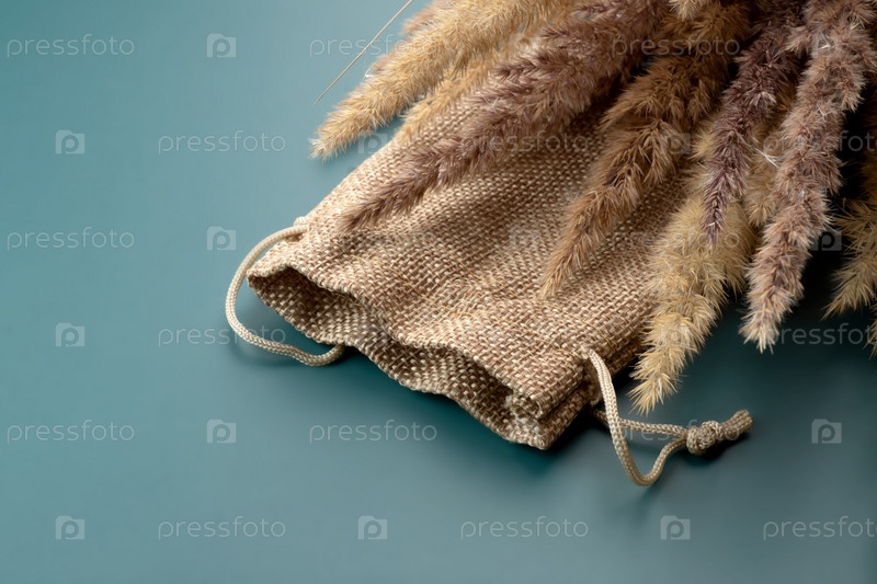 Пустой экологический холщовый мешок пустой и сухой тростник и куча сухих тростников на зеленом фоне. дизайн украшения. Осенняя распродажа макет. Концепция экологии