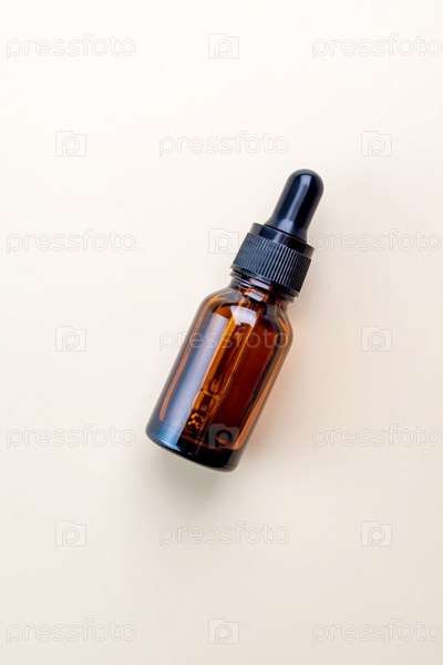 Бутылка из янтарного стекла с пипеткой-капельницей с сывороткой или эфирным маслом на бежевом фоне. Косметика по уходу за кожей Концепция красоты для ухода за лицом и телом. Место для текста