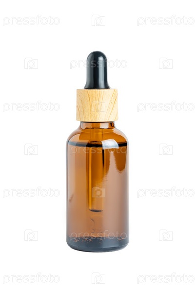 Пипетка из янтарного стекла с бамбуковой крышкой на белом фоне путем обтравочного контура. Мадицина по уходу за кожей и косметологический макет