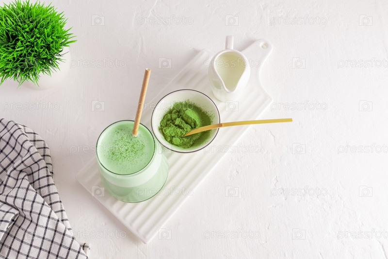 Вид сверху на большой стакан зеленого чая матча и взбитого молока на белой керамической доске. чашка порошка зеленого чая. здоровый напиток. Детокс
