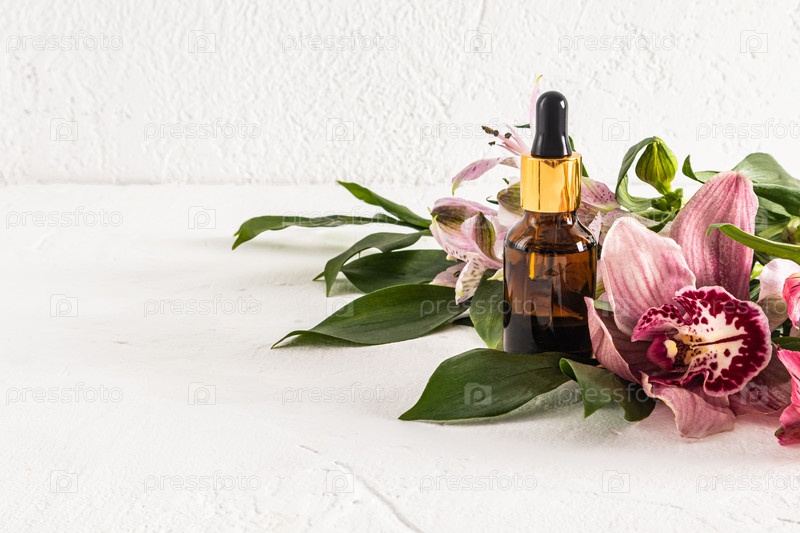 Натуральная косметика в стеклянной бутылке с пипеткой и весенними цветами на светлом фоне. передний план. место для текста