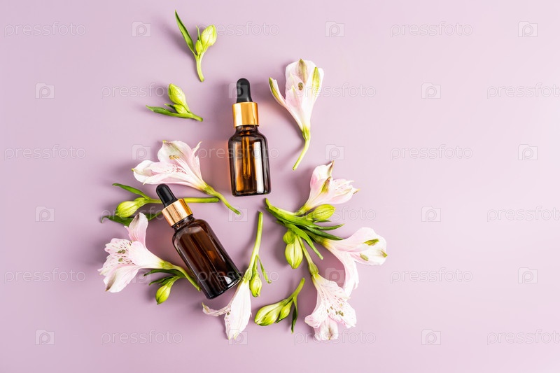 Два флакона с пипеткой с натуральной косметикой для ухода за собой. органическая косметика. вид сверху. сиреневый фон. копия пространства