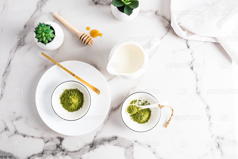 Зеленый порошок натурального чая маття в белых керамических мисках для приготовления здорового напитка. вид сверху. мраморный фон