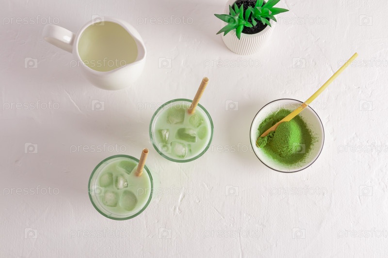 Два стакана с зеленым чаем маття латте со льдом, миска порошка маття, молочник с молоком. вид сверху. приготовление пищи на белом фоне. оздоровительный напиток