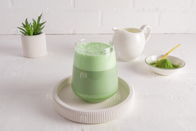 Большой стакан полезного чая маття латте со взбитым молоком на круглом керамическом подносе напротив стены из белого кирпича. бодрое утро без кофе