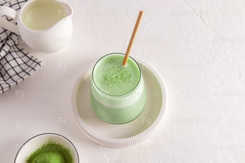 Вкусный полезный чай маття латте в стакане соломы на керамическом подносе. белый фон. здоровый напиток. Детокс