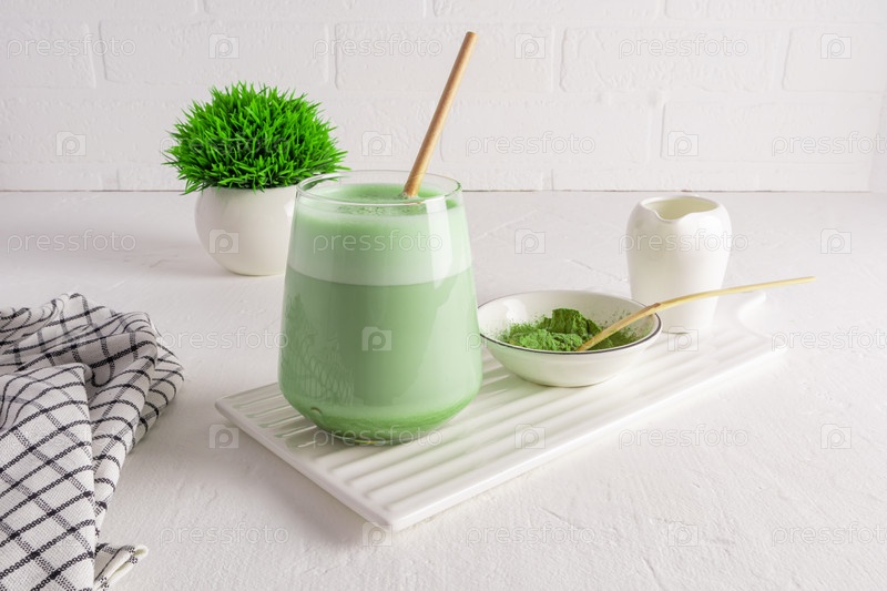 Большой стакан полезного чая маття латте со взбитым молоком на круглом керамическом подносе напротив стены из белого кирпича. бодрое утро без кофе