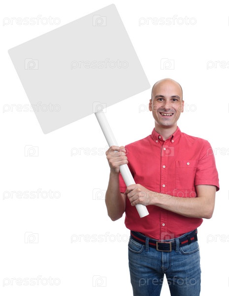 Улыбающийся лысый мужчина держит пустую вывеску