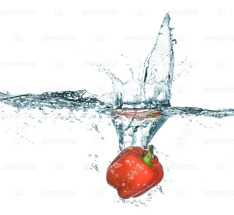 Сладкий красный перец в воде с брызгами. Изолированный