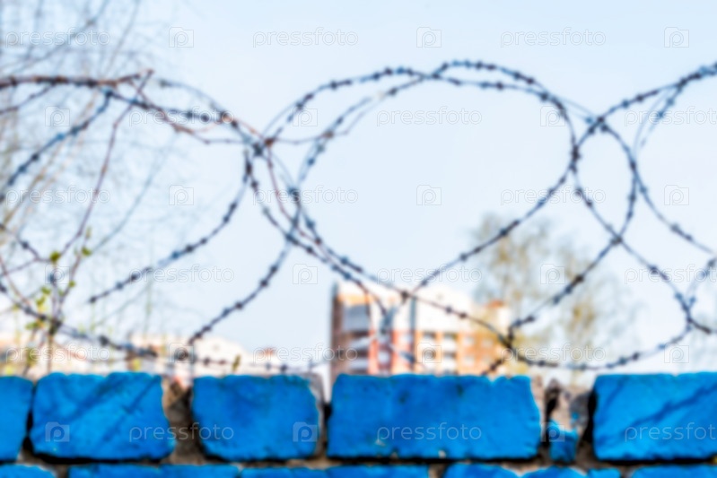 Расфокусированное фото колючей проволоки на фоне фрагмента жилого дома. Концепция изоляции