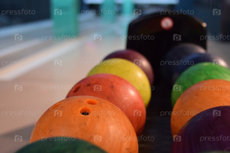 Разноцветные шары для боулинга на стойке для мячей. На заднем плане размытая рамка для боулинга. Игра в боулинг