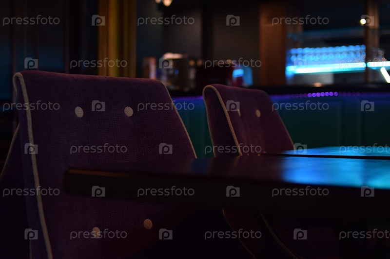 В баре за темным деревянным столом стоят два стула, обитые пурпурным велюром, с золотым кантом и пуговицами. На заднем плане размыта барная стойка. Полумрак