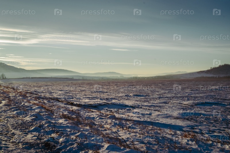 Зимний пейзаж. Заснеженное поле в лучах восходящего солнца. На заднем плане туман над холмами