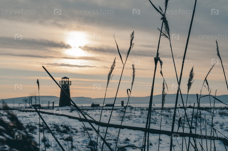 Зимний пейзаж. Колоски тростника на переднем плане. Заснеженная дорога ведет к деревянному маяку на заднем плане. Солнце пробивается сквозь тучи