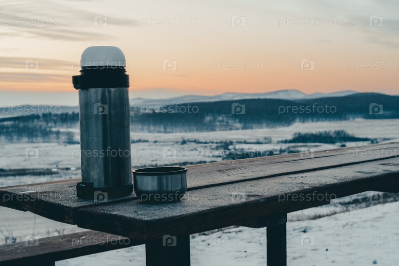 Большой металлический термос и кружка стоят на деревянном столе, покрытом инеем, на фоне зимнего пейзажа