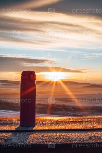 Зимний пейзаж. Рассвет, солнце встает над заснеженными полями и холмами, прорывается сквозь тучи, заливает все вокруг светом. На переднем плане на столе стоит термос