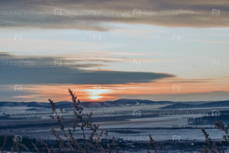 Зимний пейзаж. Рассвет, солнце встает над заснеженными полями и холмами, пробивается сквозь тучи, еще темно. На переднем плане силуэты сушеных трав