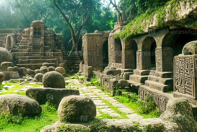 Древний ацтекский город затерянный в джунглях. Каменные постройки древней мексиканской цивилизации. Реалистичная цифровая иллюстрация. Компьютерная графика