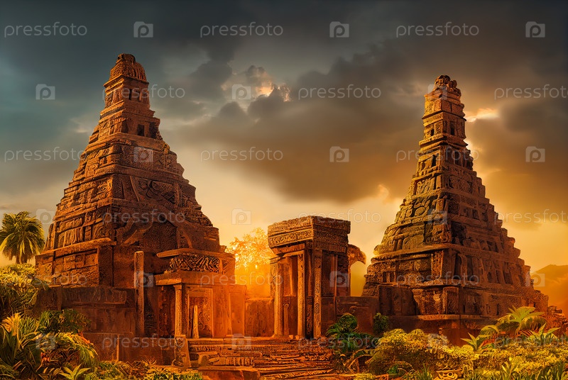 Древние пирамиды ацтеков затерянные в джунглях. Каменные пирамиды древней мексиканской цивилизации. Реалистичная цифровая иллюстрация. Компьютерная графика
