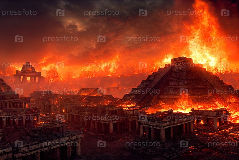Апокалипсис в городе майя. Пожары и разрушения в древней мексиканской столице. Реалистичная цифровая иллюстрация. Компьютерная графика