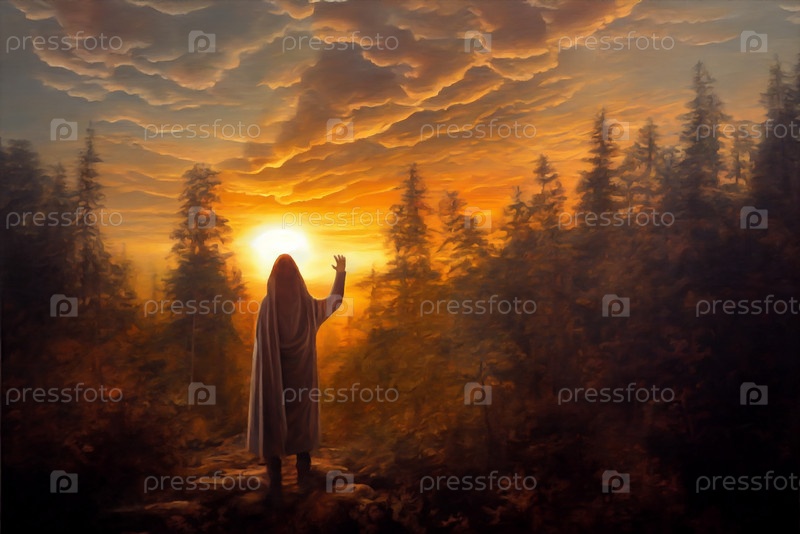 Шаман прощается с заходящим солнцем. Древний ритуал проводимый на закате солнца. Реалистичная цифровая иллюстрация. Компьютерная графика