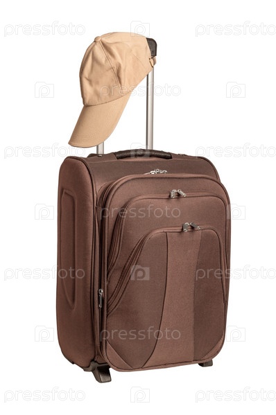 Чемодан и кепка на белом фоне