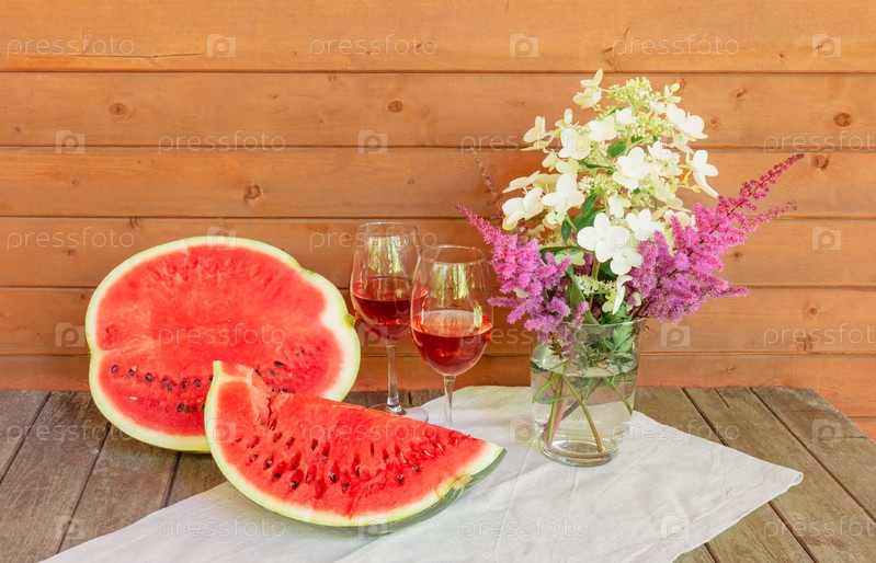 Половина арбуза, кусок арбуза, розовое вино и цветы гортензии и астильбы на старом деревянном столе