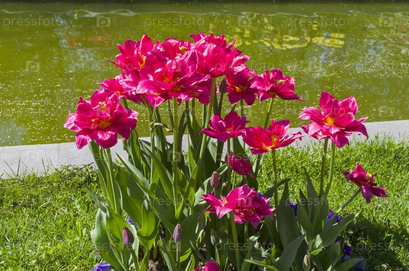 Красивые ярко-красные махровые тюльпаны на клумбе. Солнечный день в мае. Аптекарский Огород (филиал ботанического сада МГУ), Москва