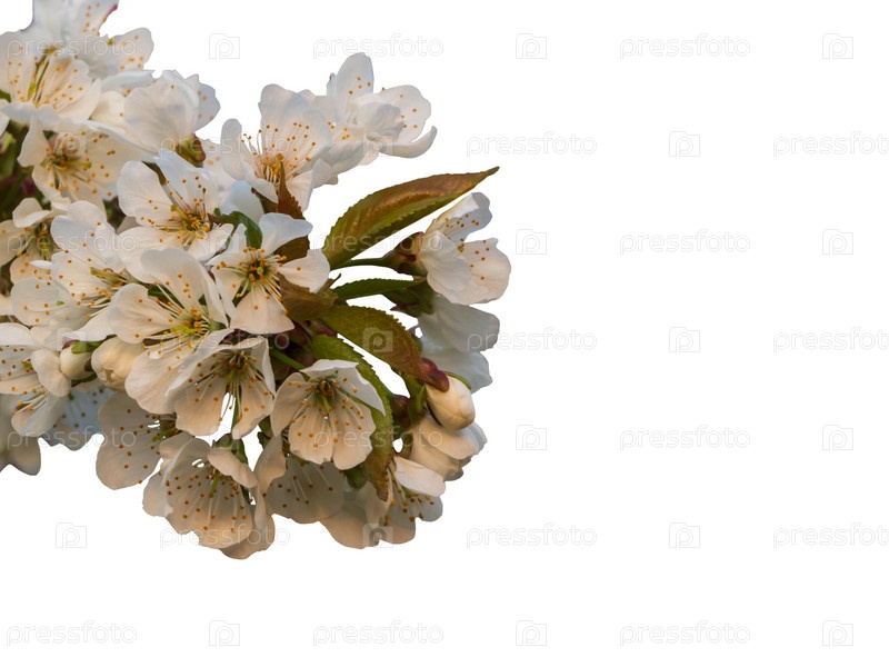 Цветущие белые цветы и бутоны вишни изолированы на белом фоне. Вид крупным планом. Деревья цветут весной. Нежные лепестки вишневого цвета для дизайна. Граница весенних вишневых цветов. фруктовый сад