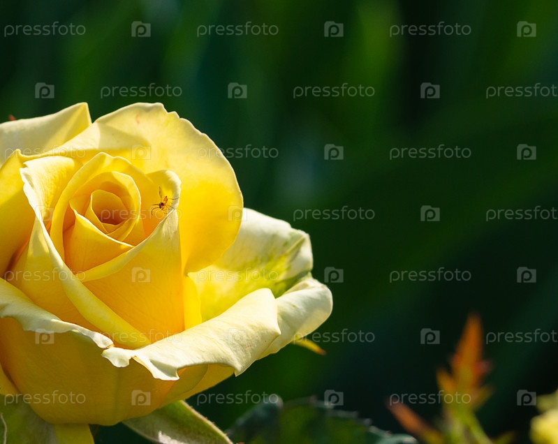 Бутон желтой розы в естественных условиях. Красивый цветок ярко-желтой розы с сидящим на нем комаром в лучах солнца в зеленом саду