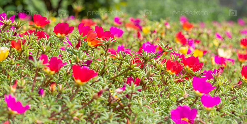Яркие цветы портулака на клумбе в парке. Небольшая глубина резкости. Красочное ложе из борщевика или портулака, также известного как моховые розы