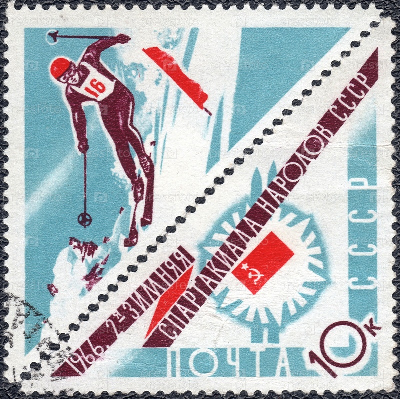 СССР, около 1966 г.: Почтовая марка с изображением горнолыжника и надписью "2-я зимняя Спартакиада народов СССР"
