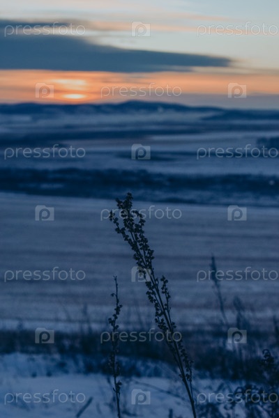 Зимний пейзаж. Рассвет, солнце встает над заснеженными полями и холмами, пробивается сквозь тучи, еще темно. На переднем плане силуэты сушеных трав