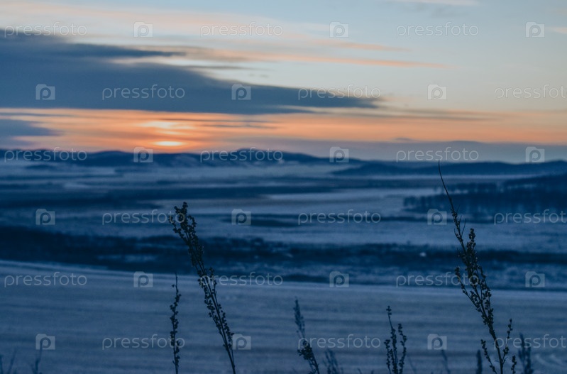 Зимний пейзаж. Рассвет, солнце встает над заснеженными полями и холмами, пробивается сквозь тучи, еще темно. На переднем плане силуэты сушеных трав