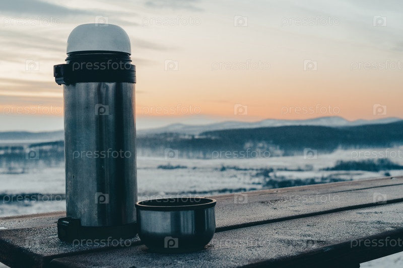 Большой металлический термос и кружка стоят на деревянном столе, покрытом инеем, на фоне зимнего пейзажа