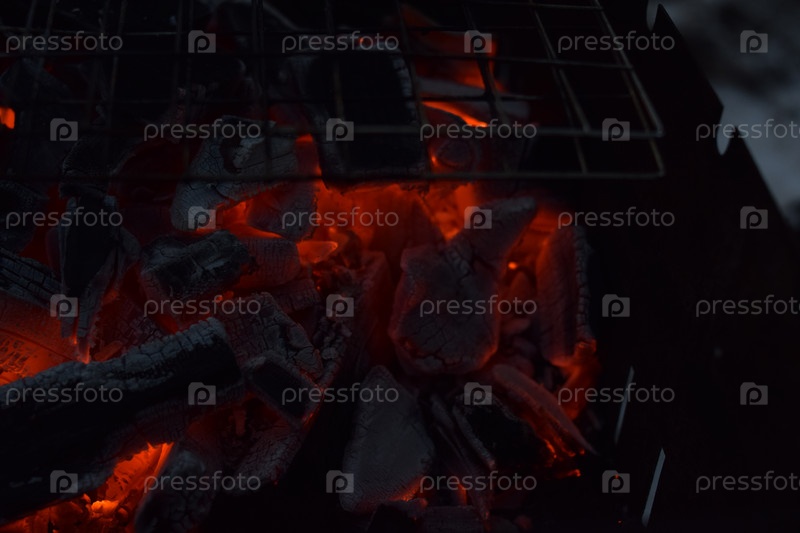 Горящие угли в мангале. Крупный план