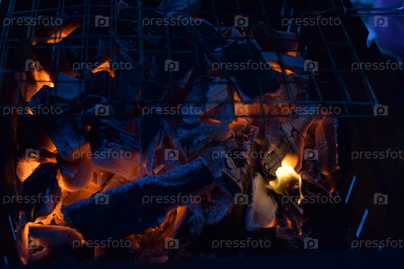 Горящие угли в мангале. Крупный план