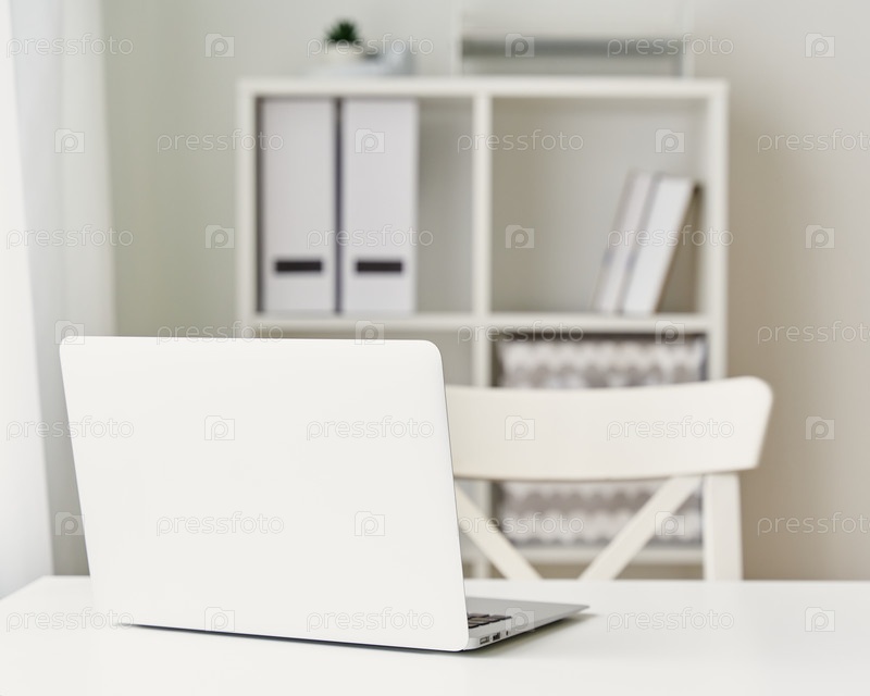 Ноутбук на столе. Современное рабочее пространство. Домашний интерьер. Белая мебель