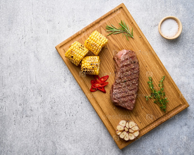 Стейк Портерхаус на гриле с жареным кукурузным початком, красным перцем, зубчиком чеснока, розмарином и солью