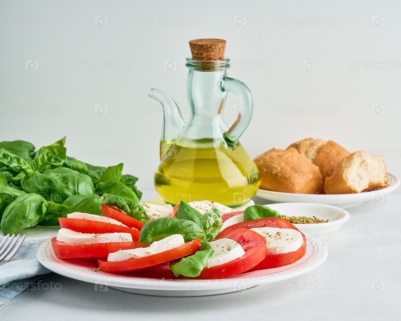 Итальянский салат капрезе. Антипасто с моцареллой, помидорами, листьями базилика, оливковым маслом и чиабаттой