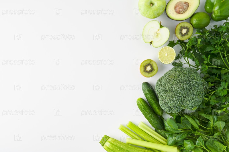 Вегетарианский набор из брокколи, сельдерея, огурца, перца, яблока, киви, лайма, петрушки, шпината, цуккини
