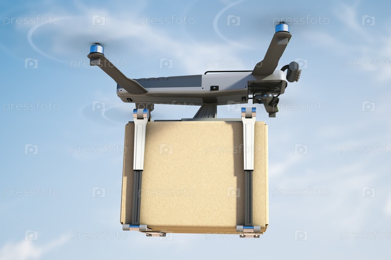 Летающий робот-курьер доставляет коробку. Концепция безопасной доставки