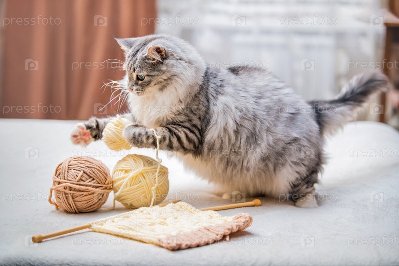 Пушистый милый серый кот весело играет с клубками запутанных нитей пряжи,