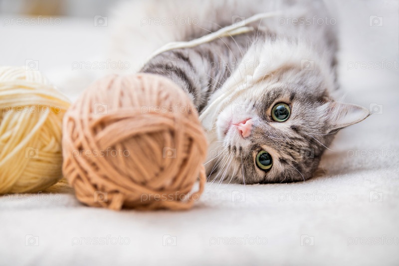 Пушистый милый серый кот весело играет с клубками пряжи, запутанными нитями, лежит среди мотков