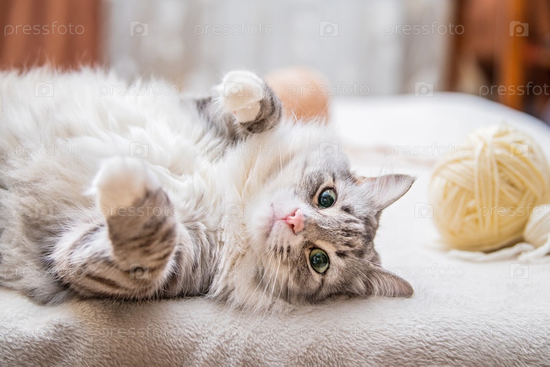Пушистый милый серый кот весело играет с клубками пряжи, запутанными нитями, лежит среди мотков