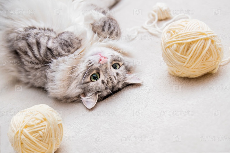 Пушистый милый серый кот весело играет с клубками пряжи, запутанными нитями, лежит среди мотков