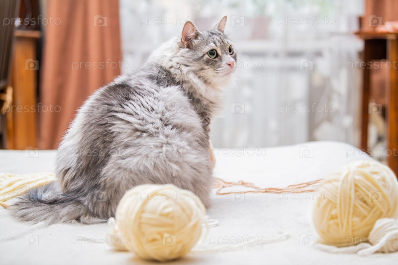 Пушистый толстый серый кот играет клубками пряжи, спутанными нитками, сидит спиной среди мотков, виновато поворачивается к хозяйке