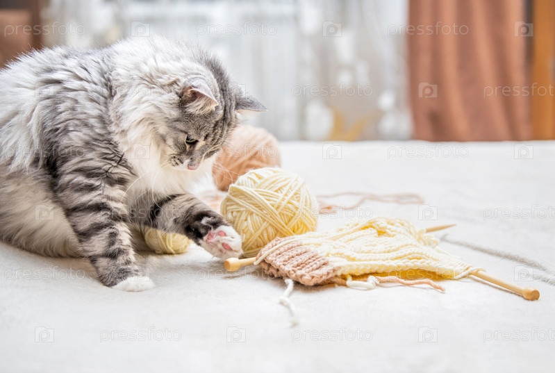 Пушистый милый серый кот весело играет с шариками из пряжи, царапая задними лапами, лежащими на спине